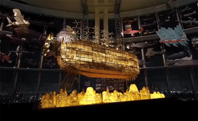 這個飛船源自於大師宮崎駿編劇兼導演的作品《天空之城》,不時咻咻叫的數十個螺旋槳,彷彿真的要讓飛船破窗而出,翱翔天際~~當觀賞距離稍微縮近一點時,仔細一看,才發現每個船體的零件,簡直就是從動畫裡偷運出來的,而且最美的是,這個定點航行的飛船還會發光呢~