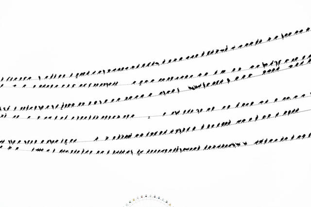 如此數「大便」是美的景象,攝影師水谷吉法決定用鏡頭記錄下來!他採用黑白色調,去構築停靠於東京多摩川沿岸電線上的驚人鳥景。一系列名為「Kawau」的攝影作品,除了帶來視覺震撼以外,同時也令人感到窒息,而這樣美麗又恐怖的河畔風光,讓人想起活潑舞動的音符,也喚起關於希區考克經典大片《鳥》的詭異回憶。
