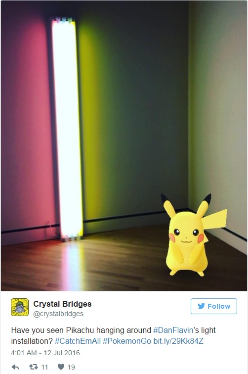 名列美國十大當代私人美術館的水晶橋博物館(Crystal Bridge Museum of American Art)同樣也發出了推特邀請遊客來捕捉館內的神奇寶貝們。館方表示,雷電系的皮卡丘會出現在「首先將電子照明帶入藝術,並以霓虹燈管藝術作品聞名」的丹弗拉文(Dan Flavin)作品旁,一點都不讓人意外。