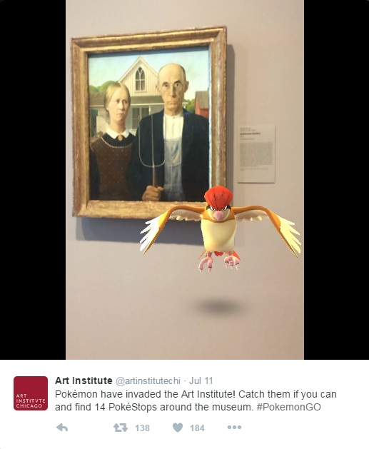 芝加哥美術館(Art Institute of Chicago)在推特上立刻貼出了海星星還有烈雀在館內的照片,並且歡迎大家來找分散在館內的14個捕捉點。其中一隻比雕剛好就在鎮館作品之一格蘭伍德(Grant Wood)《美國哥德式(American Gothic)》兩位老夫婦旁邊!