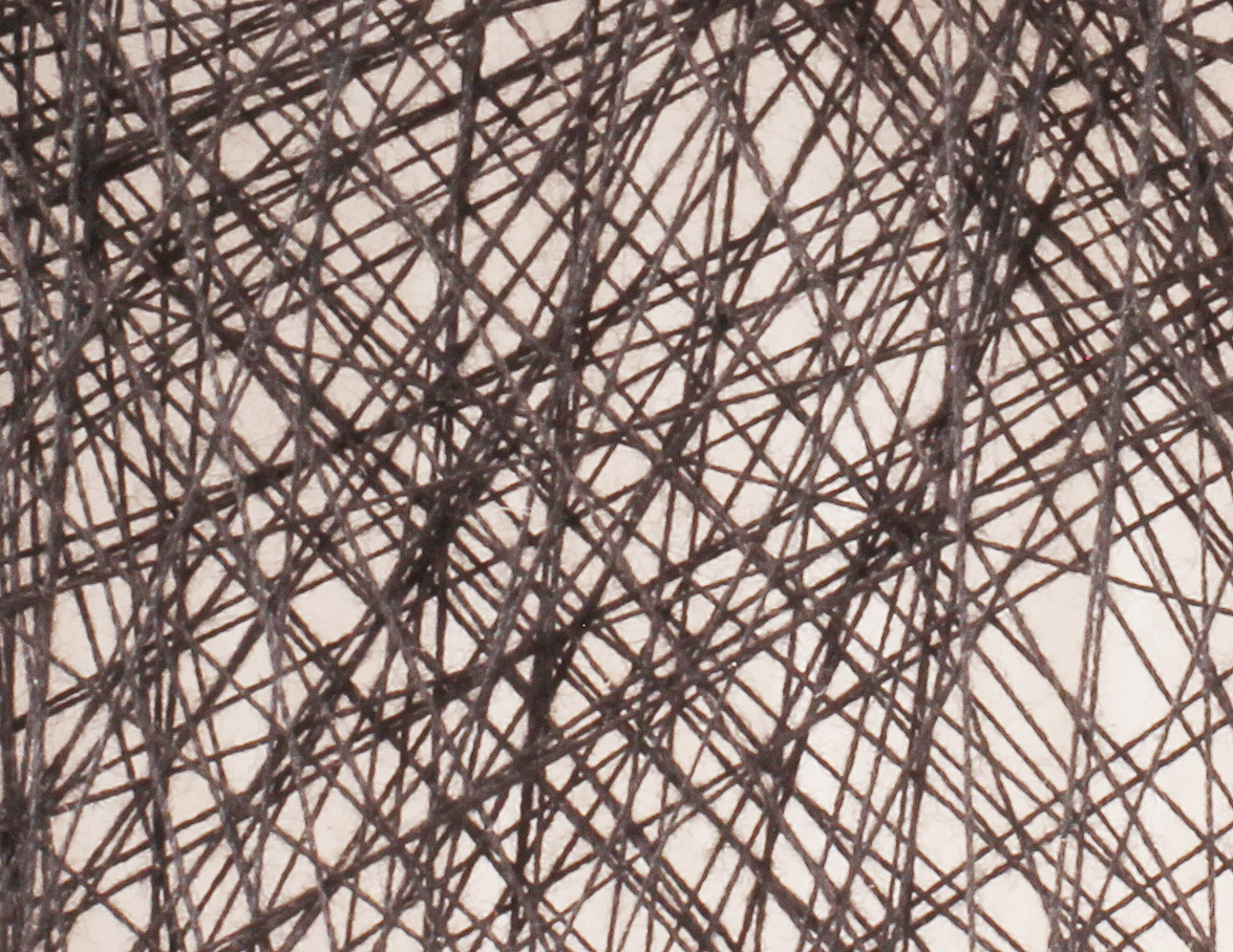 繡框的直徑約為 28 吋(71cm),外框釘了 200 個金屬鈎,黑線穿越繡框來回固定,重覆約莫 3,000~4,000 次,重疊的軌跡最終呈現出人像。