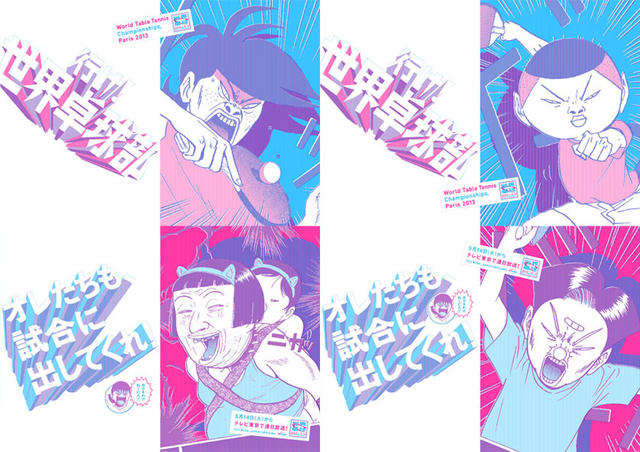 早在2012年開始,上西祐里便多次參與世界桌球海報視覺設計;2012年海報同樣分為純視覺與擁有選手的兩款風格,大家熟悉的福原愛、水谷隼、伊藤美誠、石川佳純,也自然成為海報主角,而為彰顯出桌球「快速」和「氣勢」,純視覺海報設計上以漫畫中長見的放射線條為主,搭配背景閃耀金色,極為搶眼。