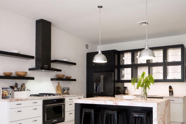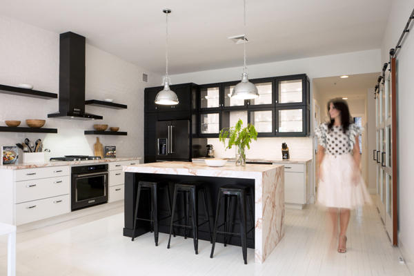 Formica Corporation 仿造大理石質感,將麥芽色紋路的層壓版,鋪墊在廚房的檯面上;Delta® Faucet 則是提供一個高科技的觸控式水龍頭,並特別添加一條固定水龍頭的色票手臂;而最重要的廚具們,是由家喻戶曉的廚具品牌 KitchenAid® 負責,冰箱、烤箱跟洗碗機,皆是黑色系不鏽鋼材質,配上新色旋鈕。