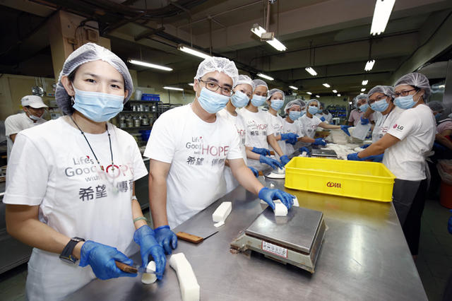 中秋佳節前夕,台灣 LG 電子董事長金載承,更率領北中南員工,挽袖擔任一日志工,於忙碌的月餅製作時期,幫助喜憨兒分擔辛勞。