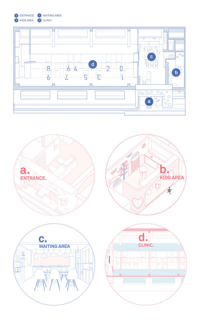 要帶小孩又要看病的爸媽也不用擔心,診所裡頭還附設 幼稚園 兒童遊樂區,入口處還設計成屋子的形狀,營造出溫暖的家庭氛圍,讓小孩在裡頭安全地玩,不會「罵罵號」,影響爸媽們的看病心情呦~另外,每個診間的號碼都被標注在走廊的地板上,藉此消除一點病人看診前的緊張情緒。