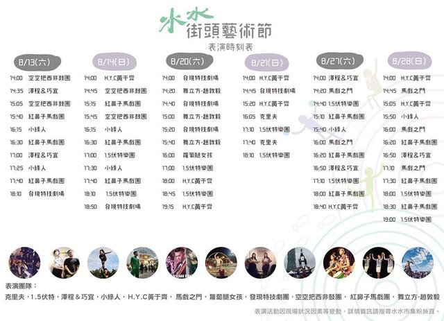 這次水水市集當然也是卯足全勁請到多組知名街頭藝人,包括空空把西非擊鼓樂團、On.P.Young 紅鼻子馬戲團、小綠人. Littlegreenman等知名街頭藝人,安排超過六十場的精彩表演,民眾不必捨近求遠,在華山就能看到國際水準的演出;而文創市集更是歷年最大,網羅皮革、花藝、木工、金工、插畫、編織、烘焙等不同媒材之手創人,超過八十個品牌共襄盛舉。