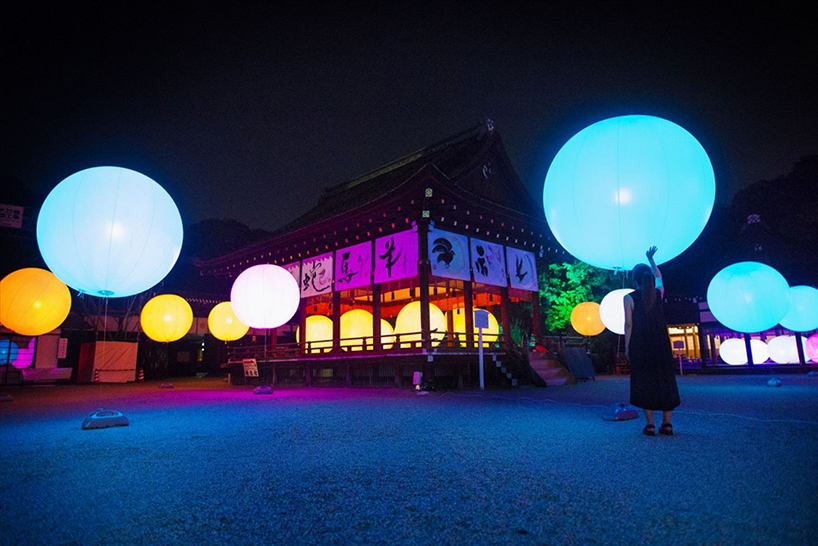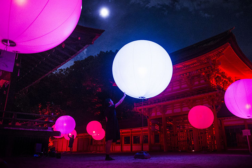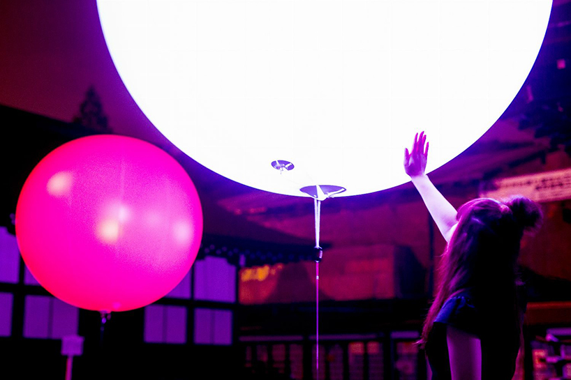 而在作品「球體共鳴」中,teamlab 在神社的櫻花門上,懸掛著許多超大型的球體燈飾,燈飾不只會隨著人們碰觸而變換顏色,還會彼此互相影響,在視覺上形成連綿不絕、豐富多彩的連鎖反應,就好像有著分部合唱的合唱曲,那麼和諧,又能各自表現出自己的旋律與精彩。