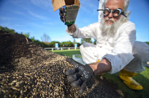 再來就是鋪上薄薄一層沙子,將種子均勻地撒在椅子的表面,並且輕輕地按壓,以防止種子滾遠。接下來就是每天定期澆水,但一樣要輕輕的,不能破壞土堆的結構,10 天內綠色應該就會冒出頭了!