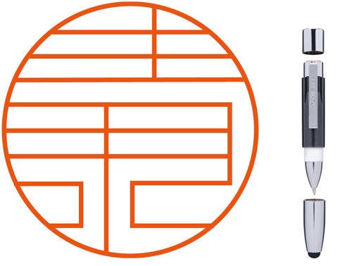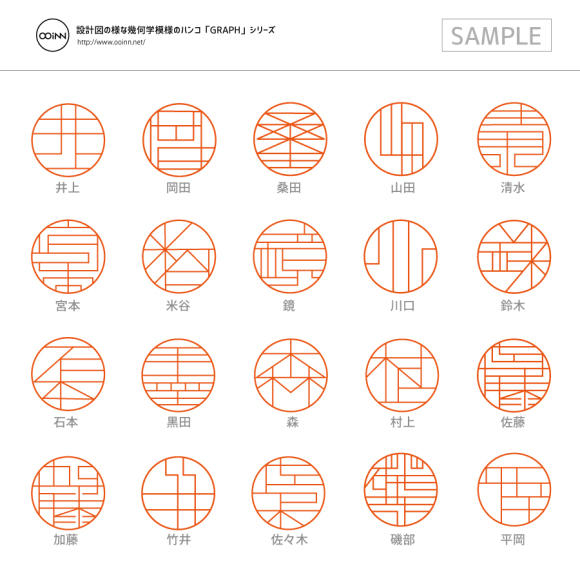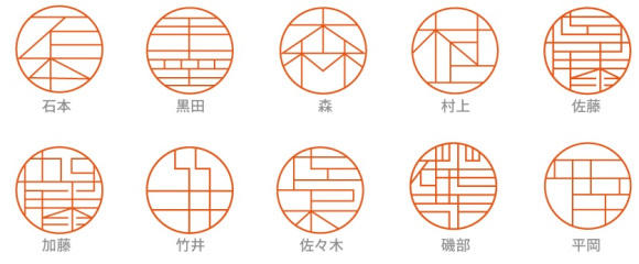 若你是個直腸子的人,或者是對細節相當講究的專業人士,如工程師、數學家的話,這個由直線組成的圖章再適合你不過了!稜稜角角的「圖畫」將漢字之美顯現無遺,每個圈圈內的線條都代表一個日本姓氏,就像光線在萬花筒中不斷反射,最終拼湊出值得細細玩味的文字世界。