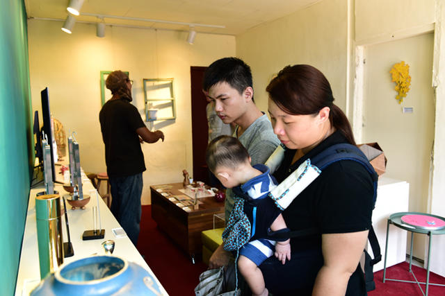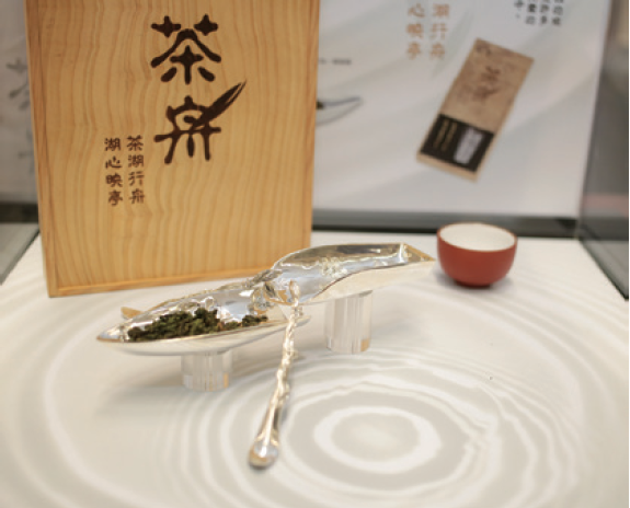 先從民以食為天的「饗」開始介紹吧!此主題的展覽空間為胡家廚房,參展作品包括:金獎得主詹曉晴的《茶舟》,以臺中公園日月湖為創作發想,將在湖上行船泛舟的悠閒回憶,沁入茶葉的回甘中;佳作洪玉芳的《花嫁》以瀕臨滅絕的台灣特有種「大安水蓑衣」為筷架造型,希望它能快點找到伴,讓生命綿延不絕。