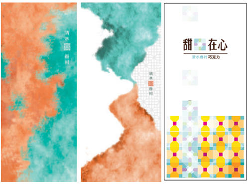 巧克力包裝的部分,則有以湖水藍、紅磚色雕飾的模糊眷村味《斑駁的憶痕》,以及《甜在心》透過窗花的玻璃折射包裝,回憶溫暖繽紛的昔日,看在眼裡,吃在嘴裡,甜在心裡。