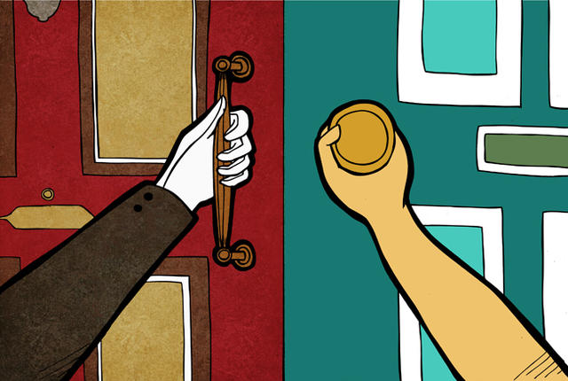 閱讀《兩扇門》得要兩邊一起翻閱,就像同時開啟兩扇門一樣。透過左右兩邊的對比,不需要文字,鮮豔的色彩、不同時代的居家裝潢與生活方式,以及兩個主角的細微臉部的表情與肢體動作,就能發現故事有趣的地方,同時也得到一些生活的啟發。