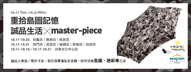 除了以上的迷彩單品外,大編在朋友那兒聽說,MSPC近期和誠品生活進行聯名合作,在十月週年慶推出以島嶼為主要輪廓的「島圖迷彩傘」。傘布的紋路靈感來源是日本的四大島嶼,設計師將其轉化為低調的拼貼迷彩色塊,此傘男生拿女生拿都好拿,最好是一起撐更加閃閃動人呦~