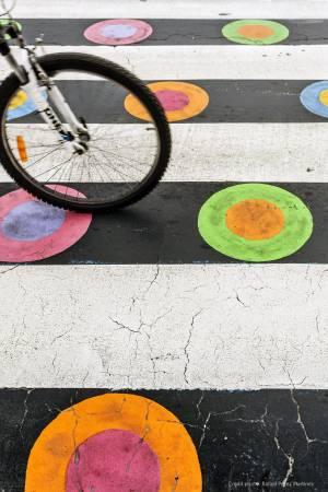 「過馬路」這一件再平凡不過的事情,要如何變得吸引人呢?保加利亞籍的藝術家克里斯多.古埃洛夫(Christo Guelov)系列創作「Funnycross」,用幾何圖形搭配亮麗的色彩,將西班牙馬德里的馬路變得色彩繽紛!