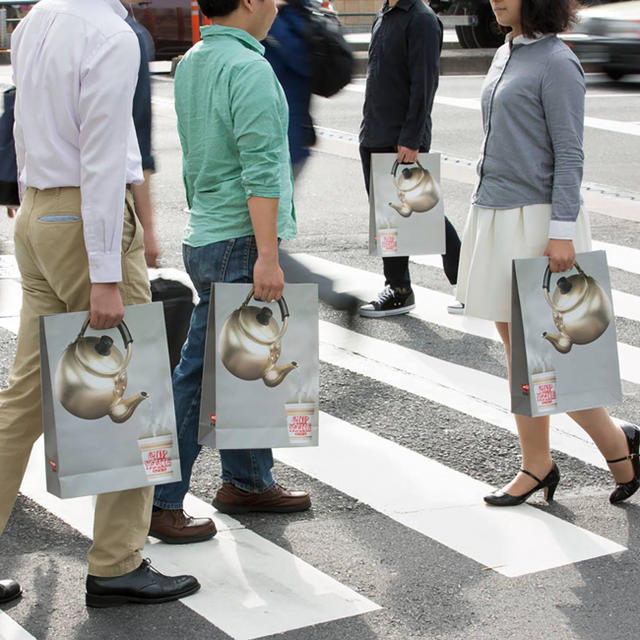 當然,這樣在人群中傾倒滾燙熱水的危險行為,並非什麼新風潮,只是個圖像罷了!就像前幾天介紹過的一秒變身樂高小人手一樣,它是個利用錯覺的設計紙袋,然而,一開始它只是日本杯麵大廠日清發在臉書上的一個趣味玩笑,沒想到五月發文至今,已累積上千人的按讚與評論。