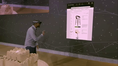 幸好,科技始終來自於人性,微軟幾天前在 Windows 10 的活動上宣布了 HoloLens 的新功能,只要搭配新的軟體,擴增實境(AR)的頭部裝置就能讓使用者以手勢瀏覽網頁,甚至還能在現實環境中觀賞到 3D 虛擬物體,也就是說,你可以把網路商店的桌椅,在購買前,就先「移」到你家客廳。