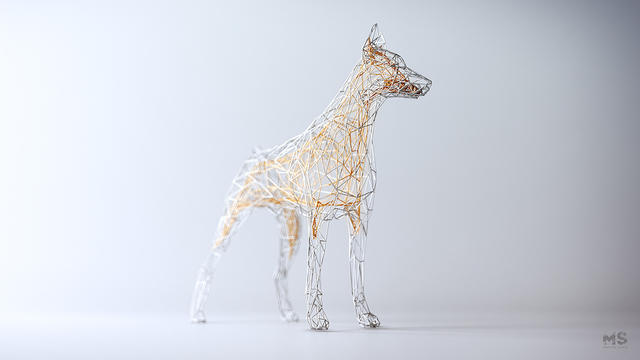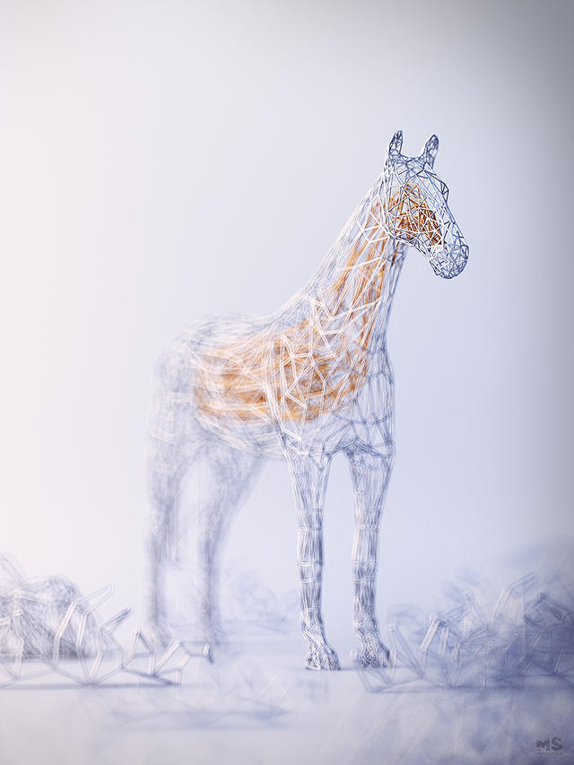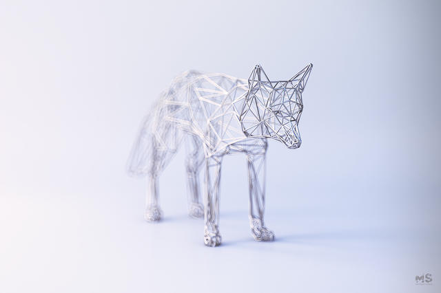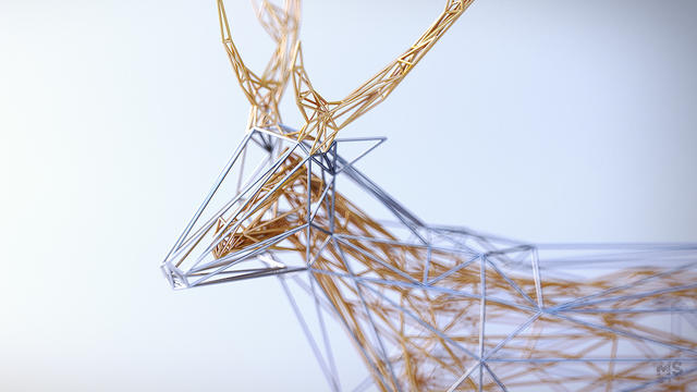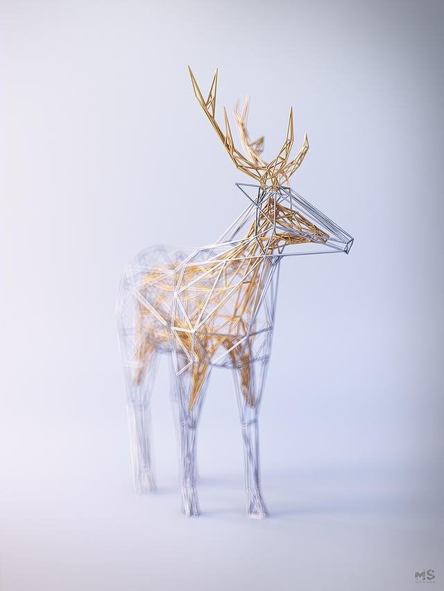 最近,Szulik 所推出的 The Wires v2 系列作品,同樣也是用點、線、面的低多邊形風格,構成一尊尊雕塑,只是這回 Szulik 是以銀線為外框,金線為核心,描繪出馬、甲蟲等森林中小動物的樣貌。這種「金包銀」的包裹效果,無論是在純白的背景下,或是同樣風格的金屬森林下,都更凸顯出 3D的圖像效果。