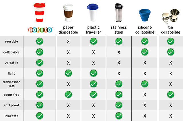 pokito 可以重複使用且材質安全,中間還有防燙的絕緣圈,讓你可以安心便利地飲用熱飲。重量只有 100 克,可以折疊起來隨身攜帶,而且容易清洗使它相當衛生,放進洗碗機也不是問題。