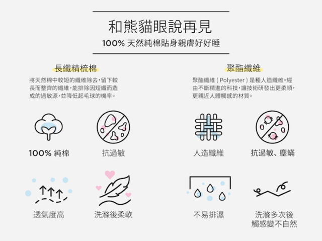 市面上平價的寢具,拆封時可能就有一股"工廠味",剛開始使用還不會有特別感覺,過陣子後便開始起毛球,刺刺癢癢的觸感不僅一點也不好摸,如果遇到剛好睡不好的夜晚,更是讓人心情煩躁,毫無助眠效果。