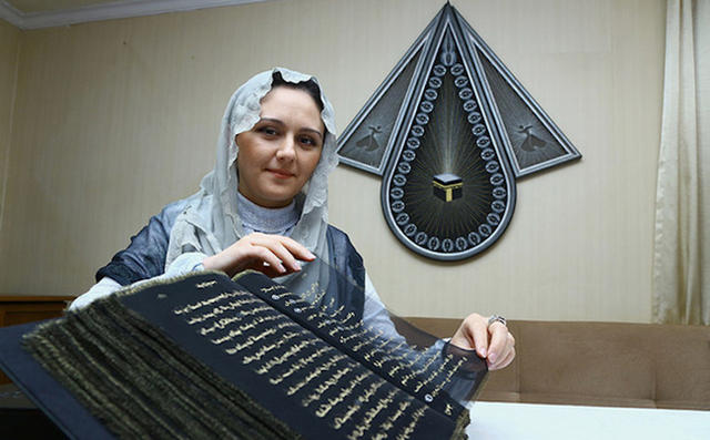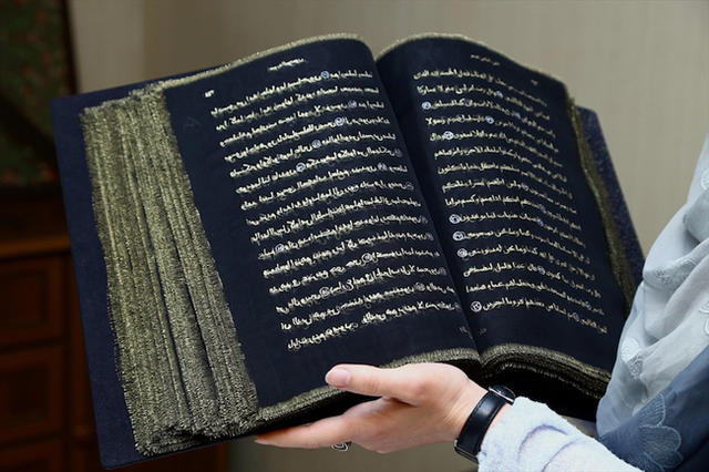 手抄文字的美,透過 33 歲藝術家 Tünzale Memmedzade 的親筆創作,再次顯現那種印刷難以達到的魅力。這位來自「火的國度」亞塞拜然的畫家,耗時三年,才完成這份以金銀墨水謄寫在黑色絲綢上的《可蘭經》,而成品的華麗和細緻也揭示了她的虔誠與耐心。
