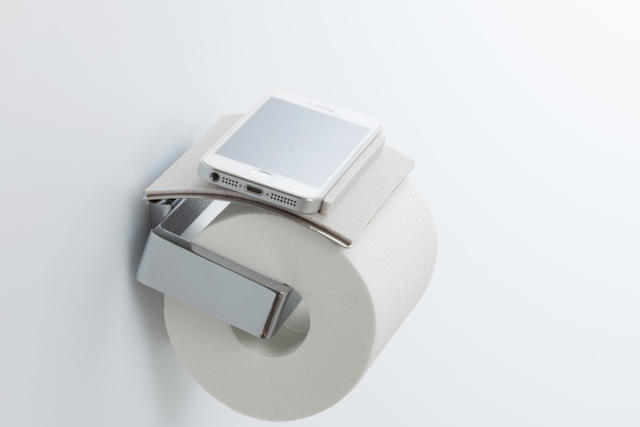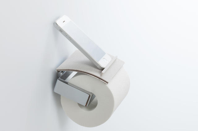 上廁所時,放在口袋裡的手機,不小心掉到馬桶裡的意外事件,時有所聞,倒不是說各個手機業者因此而紛紛幫手機開發防水功能,而是如果意外發生,多個防水功能總是多道保障。由Kanshoku Design所推出的手機托盤トイレトレイ,放置在滾筒衛生紙架上,對手機來說,可說是第二道保障。