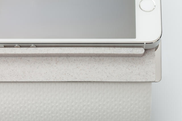 トイレトレイ以柔軟的矽膠混合火山岩作為材質,外表看起來和石英石的質感有點像,不過其實還是矽膠,反而多了防臭的功能,放在味道常常不怎麼好聞的廁所裡面,也算是非常「對味」。由於矽膠本深具有防滑功能,因此手機放在上頭,不會不小心滑下來,所以手機業者這下連防摔的功能都可以省下來了(誤)。
