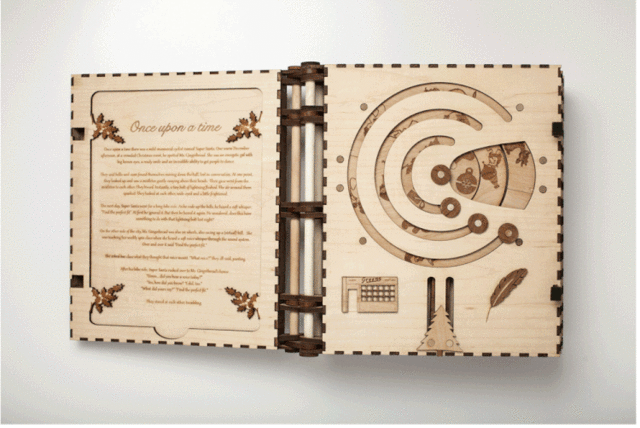 此外,每一頁都是由木頭製成,並且建構成一個機關盒子,無論是雷射切割的精緻表面,還是裡頭的巧妙機關及連結木桿,都能看出他的用心與工藝:「對我來說,要鏤刻出這些圖文,不是件容易的事。我大概切割了三四十次,才得到這個滿意的成果。」
