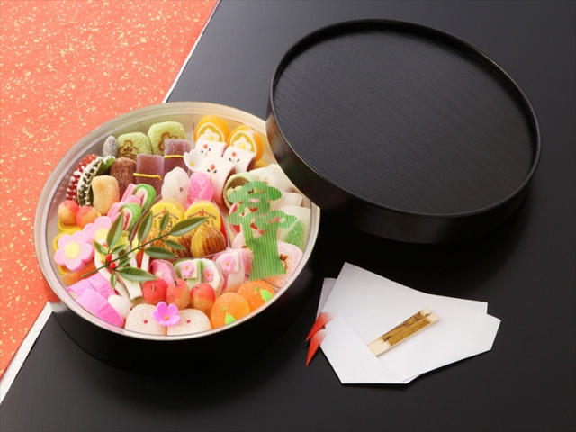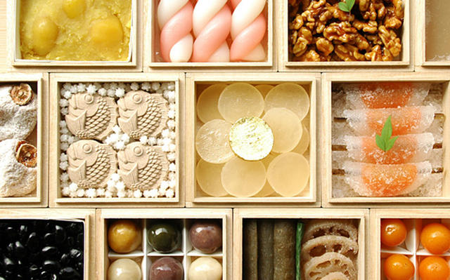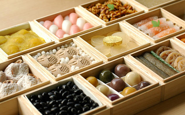 運用季節的果物創作日式甜點的人氣和菓子店舖宗家源吉兆庵,以純白的高級白木箱盛裝充滿良緣的迎春菓子,有葩餅、干柿菓子、梅餡和柚子菓子、栗甘露煮、黒豆甘露煮以及代表松竹梅的生菓子等等,精緻細膩、美感十足。