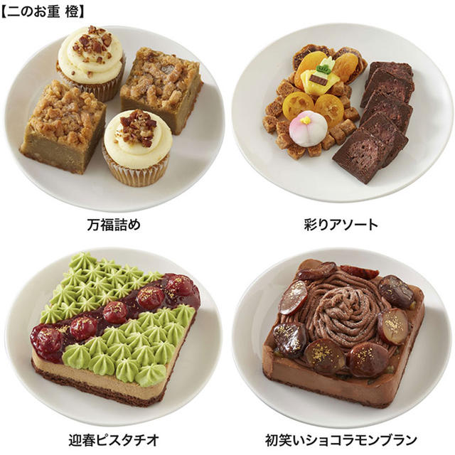 另外還有[壽甘]、[柿衣]、[白羊羹]、[牛蒡蜜煮・蓮根砂糖漬]、柑子、萌葱、牡丹鼠、薄香、濃紫等食材組合而成的[一口菓子(特別仕様)]、[鯛之生落雁・金平糖]、[黒豆煮]、[花瓣羊羹]、[栗金団]、[金柑甘露煮]和[胡桃田作]共十二樣頗富意義的甜點,一點也不輸給傳統的御節料理,把新年祝賀的氣息淋漓盡致地呈現出來。(數量限定 20 個)