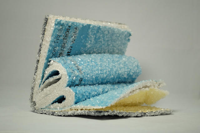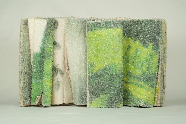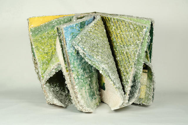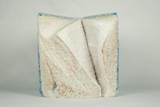 舊金山藝術家 Alexis Arnold 擅長將舊書凍結起來,提醒人們書本會隨著時間漸漸泛黃,默默地淡出我們的日常生活當中,尤其是在 21 世紀的現在,電腦、手機和網路已經取代傳統的紙本媒體,成為記錄歷史及知識的方便載體。因此,她的作品在璀璨的光芒下,更蘊含著一種定格住的哀傷。