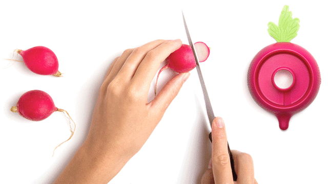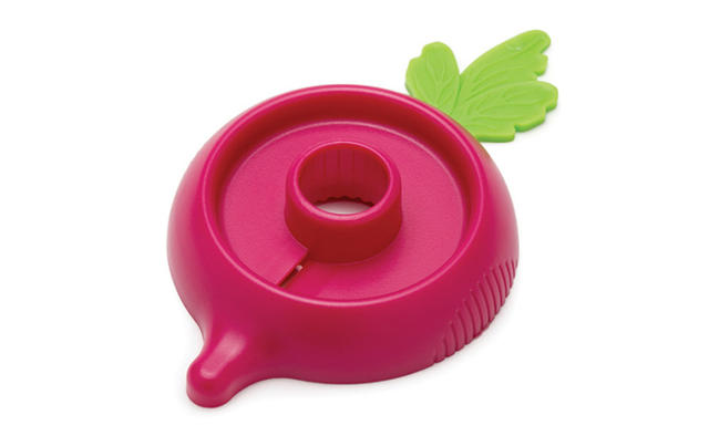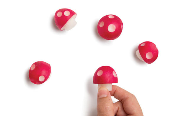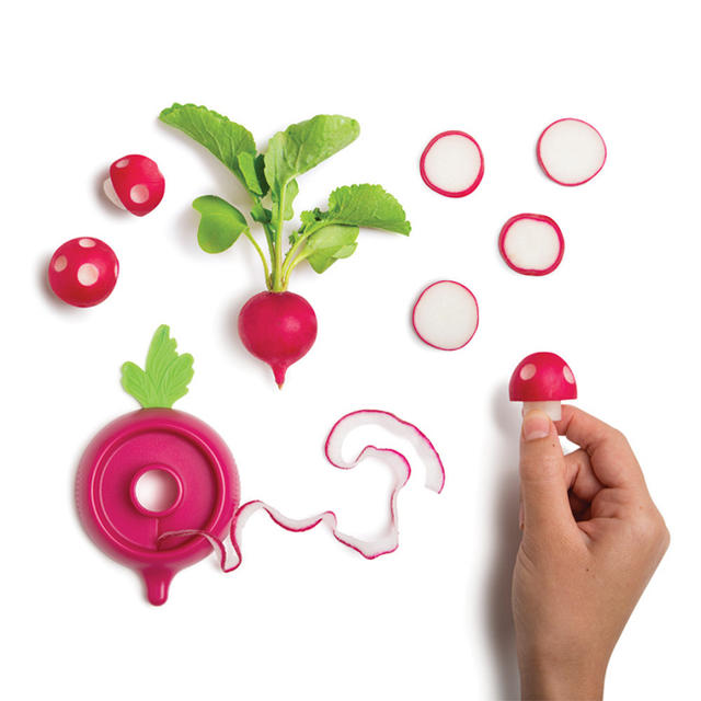 Ravanello 的使用方式和削鉛筆機很像,只要把甜菜根切掉蒂頭,放進中間的空心,轉一轉,就能把紅蘿蔔削出一個......蘑菇(無誤)!被切掉蒂頭的甜菜根少了皮,看起來就像是蘑菇柄,接下來只要利用 Ravanello 邊邊的凸起物,在「蘑菇頭」上挖幾個洞,就能製作出蘑菇的白色斑點,然後......整根甜菜根看起來就和瑪莉歐最愛吃的蘑菇一模一樣!