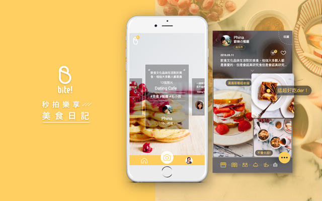 在確認手機大人已經拍飽了後,我斜眼瞄到 P 編準備將照片們上傳到臉書,而我悄悄地打開最近發現的新 APP──Bite!。沒過多久,或許是偷看到我手機一片黃的她,終於忍不住性子追問我:「這是什麼應用程式!」