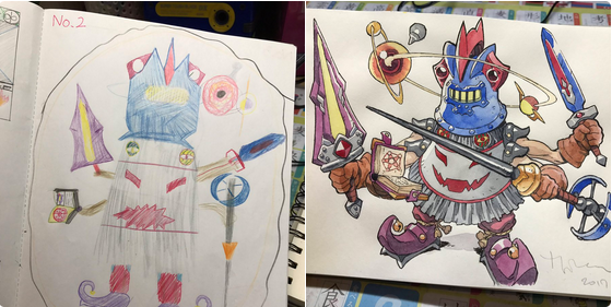 Thomas Romain 曾經參與過許多動畫,包括:水星領航員(Aria)、Basquash!、戰姬絕唱(Symphogear)、宇宙浪子(Space Dandy),所以繪畫技巧自然是不用說啦!他的兒子也喜歡畫畫,而且特別喜歡發揮想像力,畫出一張張原型人物。去年聖誕節時,Romain 的大兒子畫了一幅單眼外星人的草圖,到了 Romain 手中,立刻成為有著結實肌肉的單眼外星猛男,然後就開始了一連串 Romain 和兒子們之間的塗鴉遊戲。