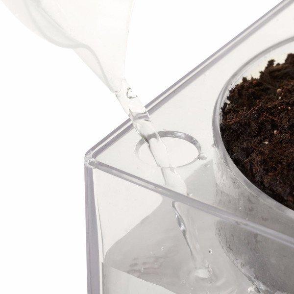 Cube 是一個透明立方體,中間有個專門放盆栽的「特別座」,座位上還有個陶器盤當「座墊」,盆栽坐定位後,只要在立方體內倒水,就能靠著 Slo Flo 被動式灌溉系統,把水分透過陶器盤慢慢滲入植物的根部,設計團隊預估,在正常溫度下,把 Cube 裝滿可以維持最多三個禮拜的水份。