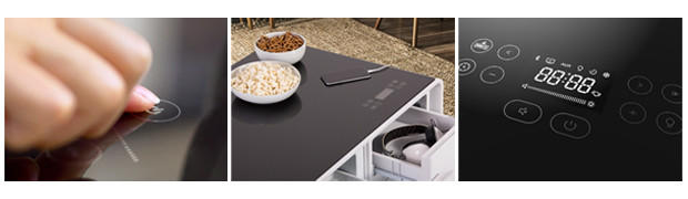 ● 桌面右下方有觸控面板,可直接調整冰箱溫度、LED 照明與喇叭音響,不需要像一般「智慧」類產品需另外下載手機 app 後才能操控。
