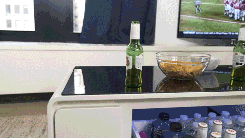 這台 Sobro 是專為現代人打造的 all-in-one 茶几,最大、最吸引人的特色就是內含一個約可容納 32 瓶酒水飲料的 迷 你 冰 箱!不是只有保冷效果的冰桶喔,而是內有壓縮機的小冰箱!