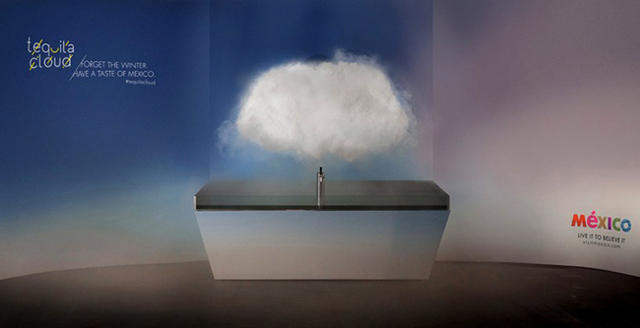 墨西哥觀光局和芝加哥創意機構 Lapiz 合作,在德國柏林的創意空間 Urban Spree 展出 Tequila Cloud,利用超音波加濕器將龍舌蘭高速震動,變成看得見的雲霧,就和天上的雲一樣,當龍舌蘭雲與塑膠容器接觸時,就會變成凝結成雨,變成名副其實的龍舌蘭雨。
