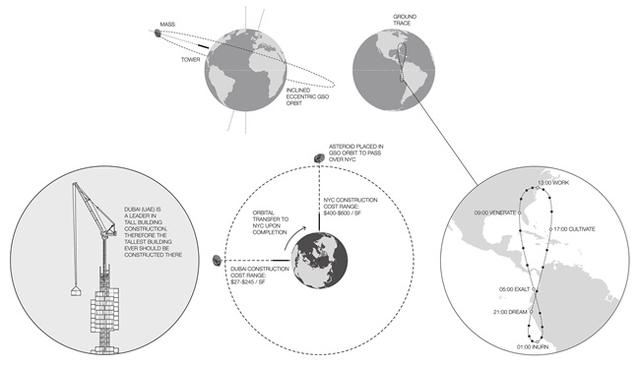 根據建築師們提出的想法,這座「日行跡塔」(Analemma Tower) 建築會運用高強度的纜線把建築固定在地表上空 50,000 公里的小行星上,垂降至地球。建築的底部則不會和地平面相接,兩者之間會有 32 公里的懸空距離……如果這個計畫真的成真,日行跡塔將會成為世界上(全宇宙?)最高的建築!