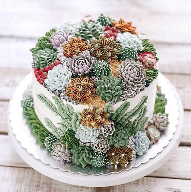 Ivenoven 的翻糖蛋糕上滿滿的多肉植物,全都是由砂糖、奶油和食用色素所組成,一旁還有栩栩如生的葉子、刺毛、針葉,每片葉子就像現實生活中的多肉植物一樣,飽滿而又獨特,無論是顏色、尺寸或是形狀,幾乎都挑不出缺點。當一個個多肉蛋糕排排站好時,就好像走進某個秘密花園一樣,一個用蛋糕打造出來的甜點花園。如果真要雞蛋裡挑骨頭,可能就是......這些蛋糕遠在印尼,咱們在台灣買不到啊!