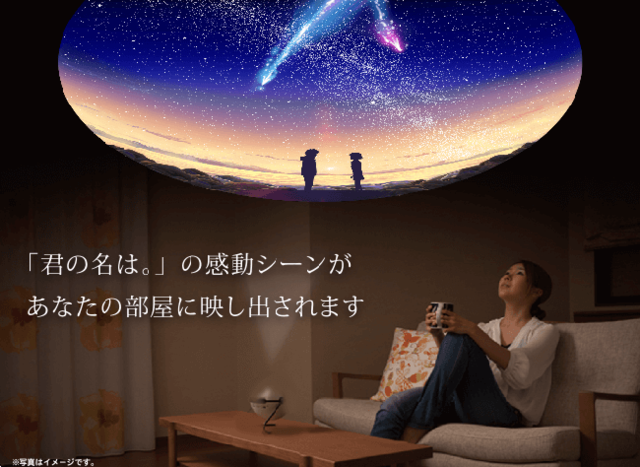 日本投影機品牌 HOMESTAR 取得你的名字授權,與曾經設計出便攜式星象儀 MEGASTAR 的日本工程師大平貴之合作,推出了「你的名字家用星象儀」,在家就能重新溫習男女主角 10 月 4 日相遇的那天,從兩人在黃昏相遇到迪亞馬特彗星出現,整片夜空的每一個變化,都直接投影在天花板上,垂手可及。