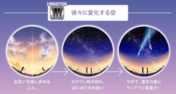此外,星象儀還會播出音樂盒版主題曲「前前前世」、鋼琴版的插曲「Sparkle」、「別來無恙」,只差男女主角沒有辦法走出大銀幕,否則就可以直接再上演一次這幕經典畫面。