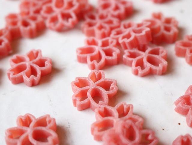 這樣美麗的櫻花義大利麵是由山形的玉谷製麵所製造出的原創商品,為了傳遞出漂亮的粉紅色澤,使用天然健康的國產甜菜染色,即使是下水煮過仍能維持美麗,櫻花義大利麵另外還有黃色的版本,低溫乾燥後的口感相當彈牙,一起應用在各式菜餚中更是大大加分。