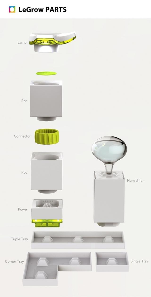 就像是塊塊樂高積木的 LeGrow,整體模組套件包含基本的栽種盆器、LED 燈泡、360 度加濕器、電源器,同時利用盆器底盤和連結器,就能像樂高積木一樣,將各組件自由堆疊及擴增排列!