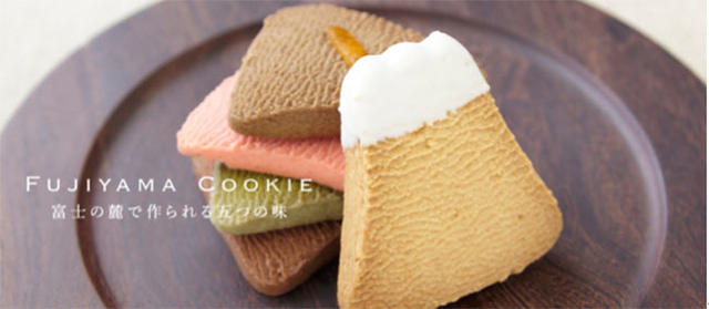 由山梨縣的「Fujiyama Cookie」推出的小巧富士山圖案餅乾,材料嚴選日本國產小麥粉及富士山產的蜂蜜,分別有香草、紅茶、抹茶、草莓及巧克力的 5 種基底餅乾,再配合杏仁豆或裹上白巧克力的口味,呈現出不同風情的富士山餅乾。每片餅乾價位約 130~140 日圓不等,也相當適合搭配抹茶一起享用!