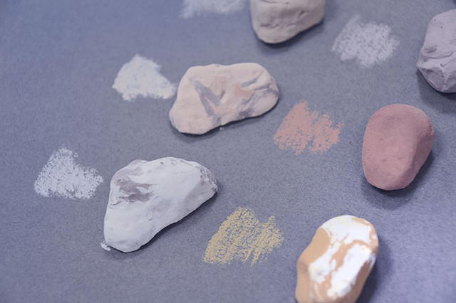 組員陳欣婷和黃于珊說,整個將石頭變成可以作畫的粉彩的過程,都是組員們一步一步實驗出來的;呈現在我們面前的顏色沒有加入任何化學色素,完全來自石頭本身的顏色。