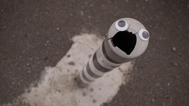 藝術家 Vanyu Krstev 在路樹、路燈,或是垃圾桶、人行道的汙漬,貼上一雙雙大眼睛,有的歪斜,有的端正,讓平凡的街頭增添了趣味橫生,特別是如果被貼的物品上有裂口、缺口,再配上靈動靈動的眼珠子,真的是比小丑還更能令人發笑。