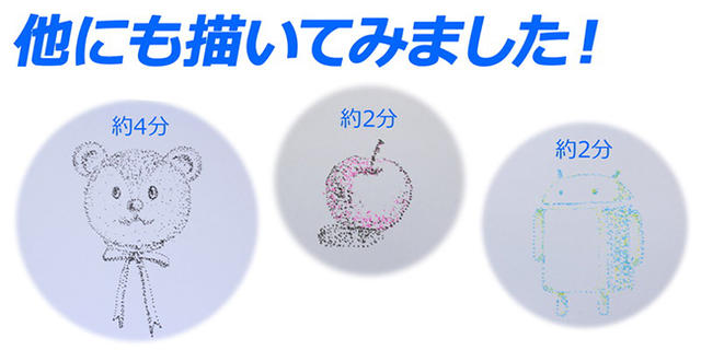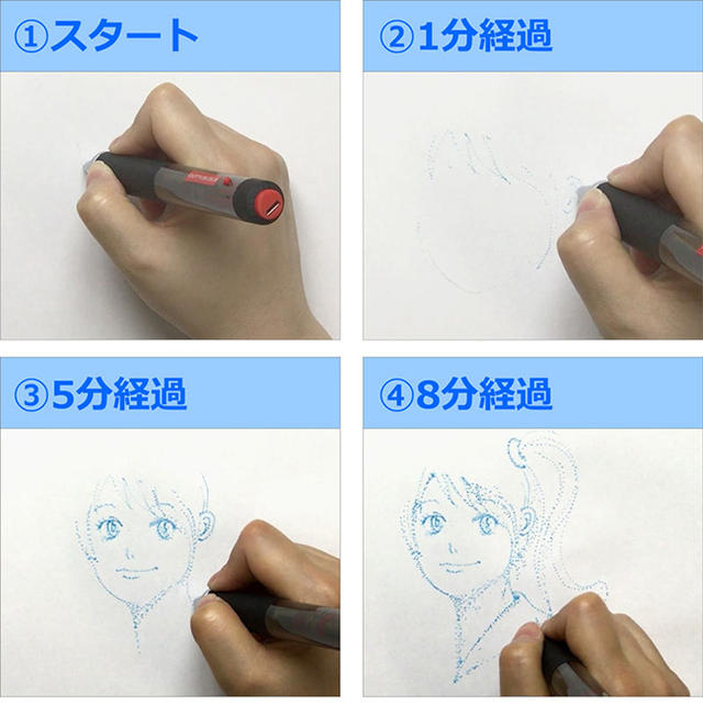 DotsPen 筆尖大約 0.5 公厘,可以在短時間內自動快速伸縮,畫出一個又一個的小點點,然後連成柔和的輪廓,進而大幅降低手腕的負擔。筆尖的伸縮速度可以調成高速和低速,高速每分鐘大約 1300 個點,低速則是每分鐘約 500 個點。