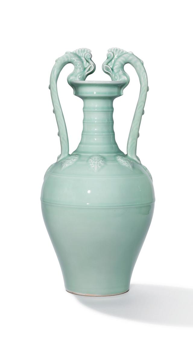 「春季中國瓷器與藝術品拍賣」清雍正 粉青釉貼花雙龍盤口尊,圖/ 取自佳士得新聞稿 Press Centre, courtesy of http://www.christies.com/