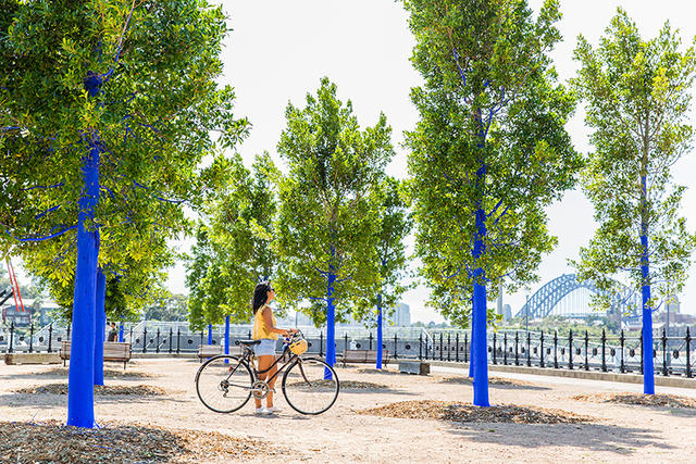 但有些人會覺得你今天倡導環保議題,卻改變樹木們原本的樣貌,不也是在破壞生態嗎?其實藝術家所使用的群青藍塗料,是天然無毒、環保的無機顏料,經過大自然的循環生長和時間的流動,藍色會漸漸變化消失,塗上顏色的目的是希望能引起忽視生活環境的人們「注意」。