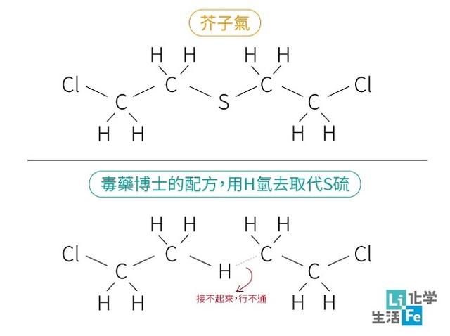 Bug 在哪裡呢?首先,芥子氣本身就有 8 個氫了,何必再硬塞給它更多的氫呢?再者,芥子氣是一個蝙蝠(俠)結構(Cl-CH2-CH2-S-CH2-CH2-Cl),中間的身體就是硫。一旦你試著將硫取代成氫,那這個結構就會瓦解!